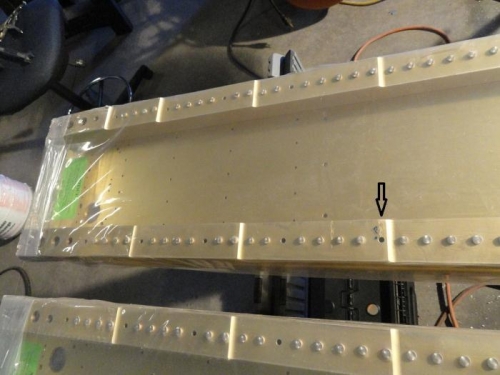 I pulled the wing spars from the box and placed them on sawhorses side by side. I opened the plastic covering and pulled it back from the outboard ends so I could install the spar extensions. I also counted the factory-set rivets, only to find that one was apparently missing (see the arrow in the first picture). Now I'm glad I've been doing the rivet count. I've emailed Van's to see if it is indeed missing or deliberate, so the current count relfects what I found.