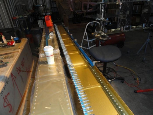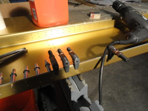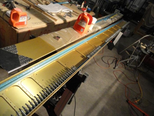 I cut four long stringers and four short stringers, using a chop saw. I then started with the right spar and positioned a long stringer on the top flange and used the flange as a drill jig to drill the stringer. I used a 1/16" drill bit to ensure the stringer flange was above the spar flange. I then added the short stringer. Then I repeated with the other flange and two more stringers. Finally, I removed the stringers and marked them and finished by final-drilling the remaining #40 holes.