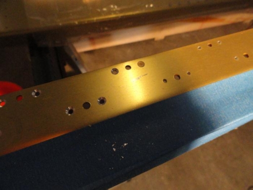 Countersunk the spar for riveting per the plans. The first picture shows a typical nutplat rivet countersunk flush to the spar, with a test rivet in place. For the locations under the wing skin, I made a test peice of .032 with a #40 hole dimpled as the skin would be. The second picture shows it in use. The third picture shows how a test rivet looks in the slightly deeper countersink needed to accomodate a dimple. After doing all the flange countersinks, I final-drilled and countersunk the holes at the root end of the web.