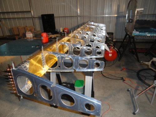 After primer had dried, I assembled and riveted the bearing support parts. I assembled and riveted all the flap hinge supports to their respective ribs and then added the bearing support to the inboard rib. Next I riveted all the ribs (with the exception of the outboard rib) to the spar web. The seven ribs called out in the plans also got a single rivet in each flange.