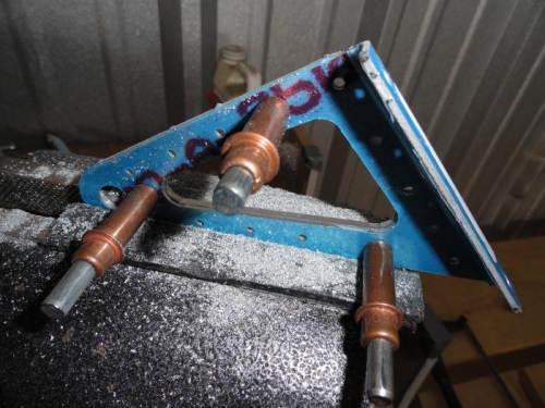 Following the diagram on page 14-6, I bolted all the ribs to the left spar, torqued to spec (20 - 25 in/lbs), and marked each bolt with torque seal. I then trimmed two of the parts for the aileron hinge brackets per the directions, put the four assemblies together with clecos, and used files to smooth the tooling marks on the inside of the part. Next I used the scotch-brite wheel to smooth the outside of the parts. After that, I match-drilled the parts for the #30 rivets and the disassembled all the parts, marking as I went, before deburring all holes and edges. The final step was to prime all the parts in preparation for assembly.