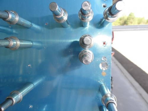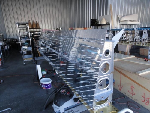 Countersunk the screw holes along the inboard edge, except for the aft-most one, which was dimpled. Then countersunk the #40 hole for the wing walk. Next, removed the skins, doublers, and J-stringers and cleaned up the edges of the doublers and J-stringers. Deburred holes and then used a squeezer to dimple the J-stringers. Removed the remaining blue plastic from the doublers and stringers and the inner surfaces of the skins. Used a file to cut down the overlapping corner of the skins per the directions and then primed the area where the alclad had been removed. Dimpled the skins in a C-frame tool, except the aft row of holes, the outboard holes (for the wingtip) on the outboard skins, and holes previously countersunk. Then I removed the remaining blue plastic from the skins (setting them in ths sun to heat the plastic and then using the pipe section used for bending the empennage leading edges worked extremely well) and clecoed everyrhing back to the structure in preparation for riveting.