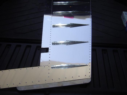 Back-riveted stiffeners to skins, along with top and bottom ribs. Riveted shear webs to right side stiffeners. Cleaned the skins and scuffed the trailing edge of skins and trailing edge piece and cleaned again with mineral spirits. Mixed 11 oz. tank sealant and spread approximately half on trailing edge piece and clecoed it to the right skin. Clecoed left skin to bottom rib and began working my way up the rudder assembling the stiffener halves and shear webs, riveting as I went. Finished riveting the bottom rib, including the pop rivet at the aft end, then put clecoes in every hole in the trailing edge. Supported the trailing edge on a straight 4x4 and put another board on top to keep the edge straight while the tank sealant cures.