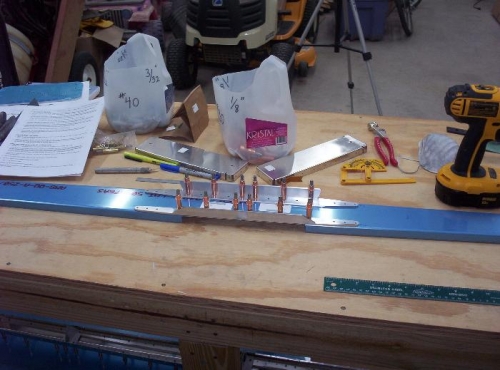 Not much time today so all I did was cleco the HS-710 reinforcement angle and HS-714 splice angle to the two HS-702 front spar channels and drill/match drill all the holes inboard of the HS-404/HS405 rib attach points. Then I removed the angles and tapered the ends using my band saw to rough cut and then the scotch brite wheel to finish them. Next I'll need to bend the ends at a 6 degree angle.