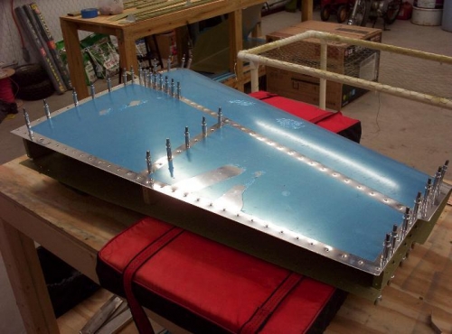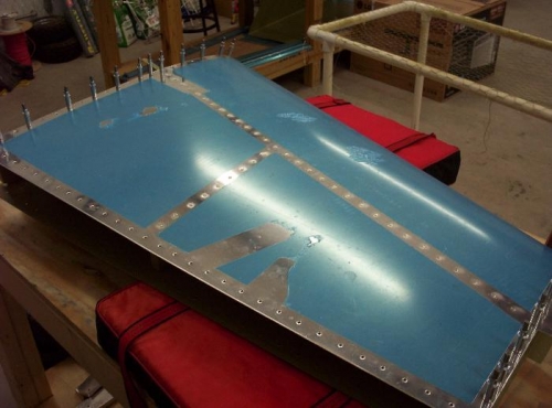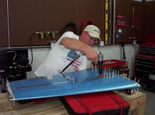 As per the plans, I started riveting at the intersection of the VS-707 and VS-702 and worked towards the tip of the vertical stabilizer. I then restarted at the same place and riveted along the front spar toward the root and along the VS-707 rib from front toward the rear spar. There was easy access to allow me to buck and rivet by myself. I used two seat pads to hold the VS up off the bench so the clecos on the bottom wouldn't end up damaging the skin while I riveted the top.