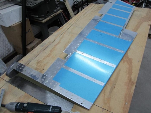 Before I riveted on the left elevator skin I applyed some Right Stuff RTV at the end of the levator stiffeners to hopefully eliminate any vibration that may cause cracks later on. Then I placed E-714 counterbalance weight inside E-713 counterbalance skin with screws partially inserted and inserted the skeleton. After everything was clecoed together I got busy setting rivets.