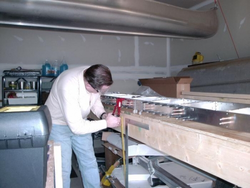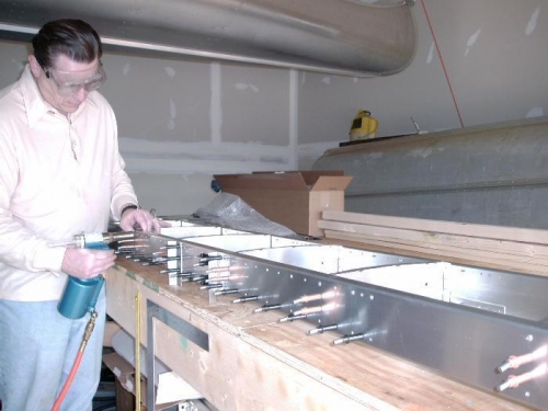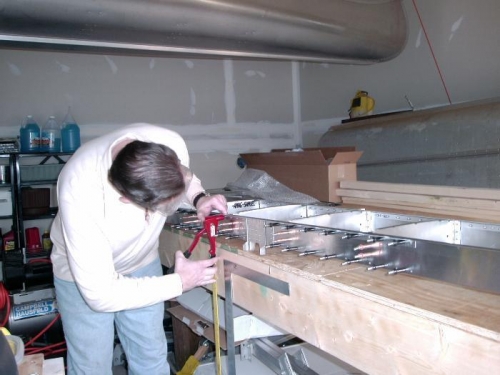 Riviting the Skeleton, top row of rear spar had to be hand rivited because pneumatic riviter head is to large to fit under flange.