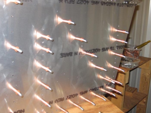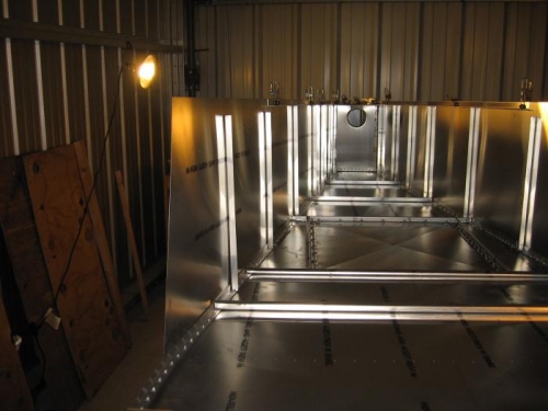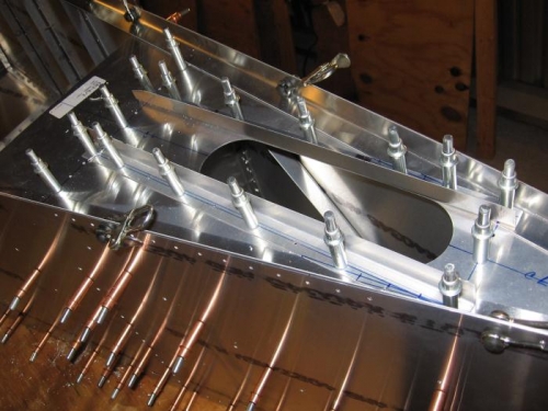 joggled "L" angles for upright support of right side rear of fuselage. Drilled and clecoed right side sheet to bottom rear stringer. drilled and clecoed horizontal tail to right and left side sheets. Cut "L" angle to length and dilled and clecoed to an angle between the 2 H. T. lined up and pre drilled part # 6B3-6/1 to 2 H. T. Cut 2 "L" angles and pre drilled to part # 6B3-6/1.
