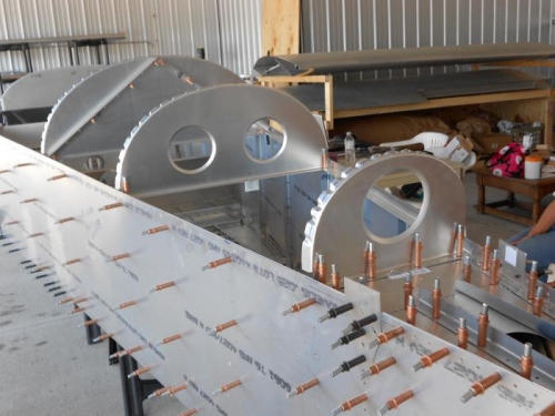 positioned and drilled the three bulk heads to the fuselage. Added the nylon guide for the elevator cable to the 2nd bulk head per plans. added stiffiners to the rear of the baggage area bulkhead per plans. pre-drilled the holes for the top skins into the bulkheads per builders guide and plans.