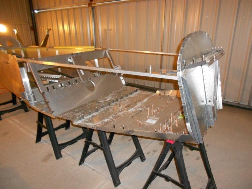 Taking apart front fuselage assembly so it can be deburred filed and cleaned. deburred main thru wing spar and uprights, drilled holes in uprights for wing attach bolts and rivited uprights to spar. trimmed and filed and deburred front side skins. Took steel parts home to be cleaned deburned and painted before reassembly.