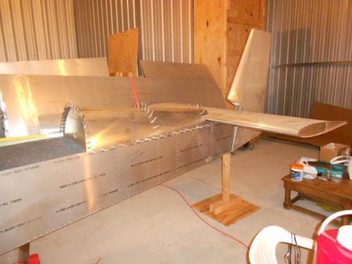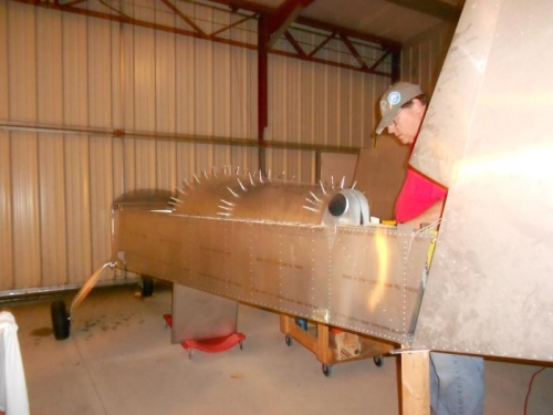 With the help of Chris Mate predrilled rear top skin to bulkheads and fuselage sides. Cut out rear top skin so horizontal stabilizer fits in per plans and photo assembly guide. Chris Mate cut carpet to fit baggage area.