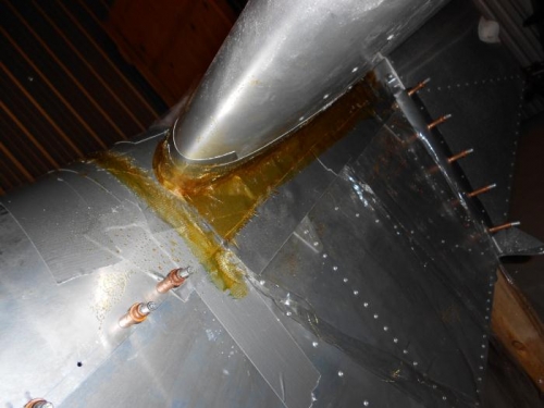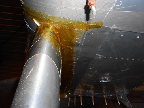 Prepared airframe surface to use as mold for fiberglass fairing.