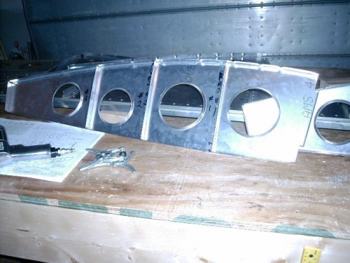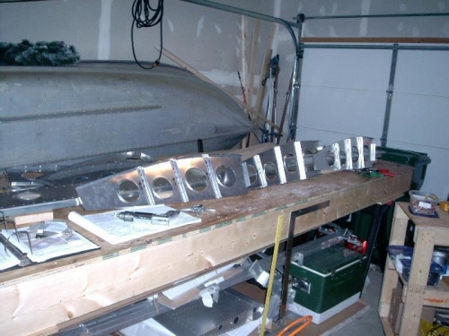 set up rear ribs with stifiners for walkway. cut out nose ribs 1 thru 3 for bar at top & bottom of spar, also drilled holesa for fuel lines.