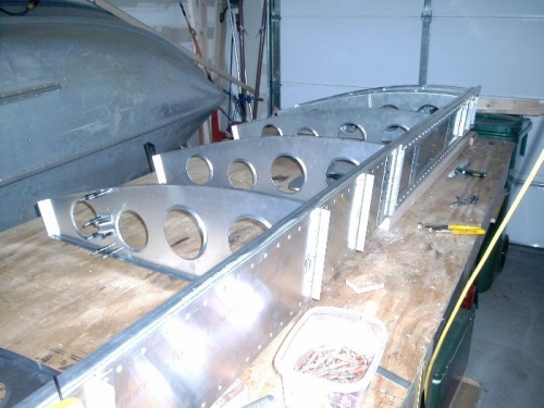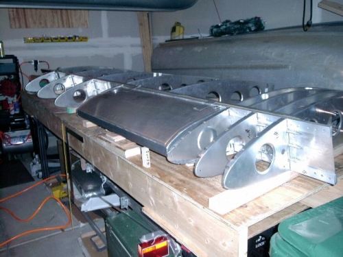 positioned, pre-drilled & clecoed rear ribs & nose ribs in place. all holes need to be drilled to final size.