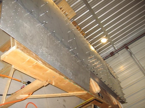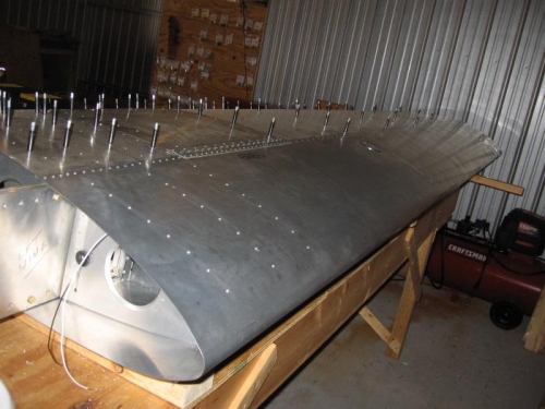 applied Cortec for anti corrosion protection, clecoed top skin and nose skin in place and started riviting the skins.