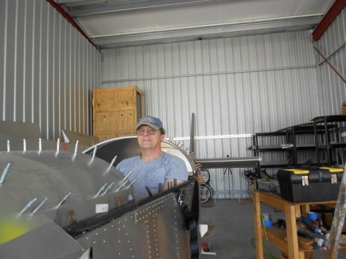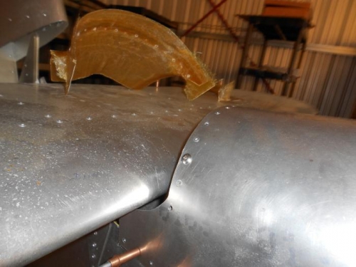 Sat in airplane!!! (Sorry, no airplane noises). Chrismate dilligently sanded the tail horn all day long. I removed rear and middle top skin. Installed nut plates to rear bulkhead to hold fiberglass when complete and trimmed top rear skin even with rear of bulkhead. This will allow for the removal of the horizontal stabilizer without removing the top rear and middle skins. Deburred all skins and bulkheasds. Applied anti corrosion. Started riveting skins to airframe.