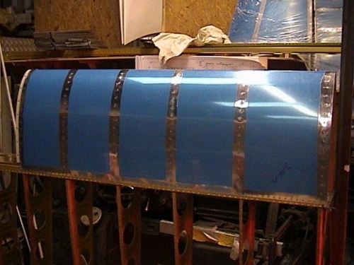 Riveting the gap fairing and flap brace in place.In photo 2 you may well have noticed new concrete block work. It's getting colder and colder these days, and I am building in a 50'x75' workshop, so I have taken some time out to build a smaller room inside, which is much easier to keep warm and cosy.