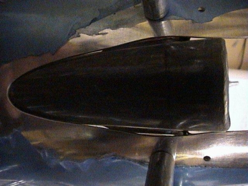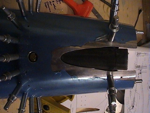 (1) After fitting the rearmost bulkheads and tailwheel mount and skin, the exit hole needs cutting to suit. Make sure there is no chaffing here as the tail wheel mount is steel and will soon rust once the primer is rubbed away.