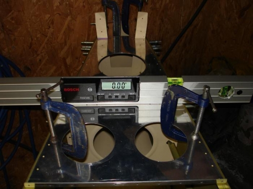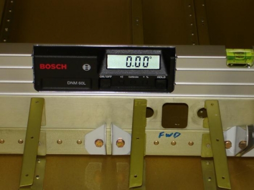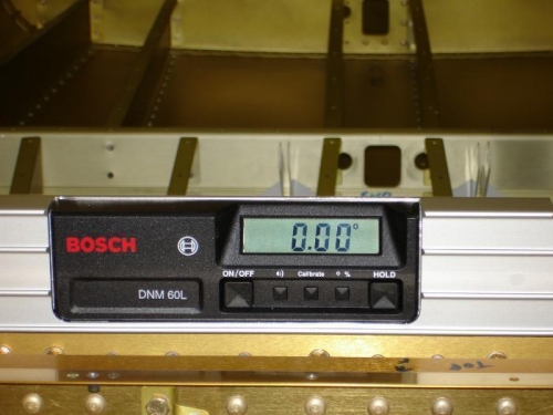 Once the longerons are fitted and all the skins riveted, the fuselage needs levelling and checking for twist. Mine had 0.2 degree twist. By twisting the aftmost bulkhead in the opposite direction, and then clamping the aft deck to the longerons, this was cancelled out to zero before riveting, as the whole fuse then becomes very rigid. I bought a digital level, it is accurate to 0.05 of one degree.