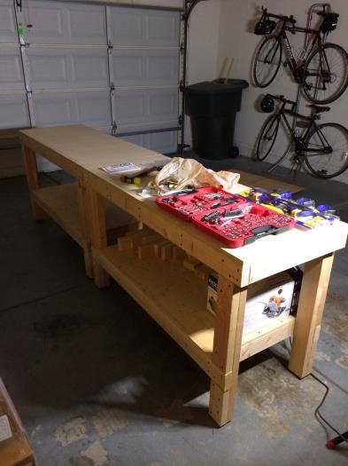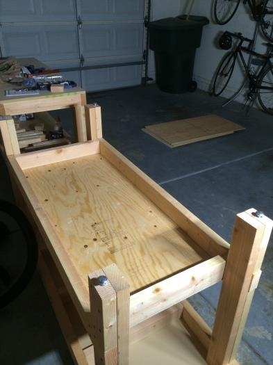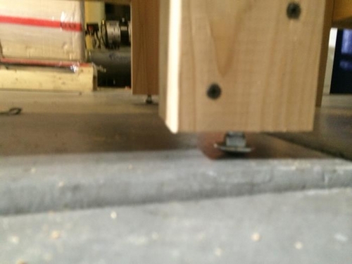I used a rubber mallet and scrap 2x4 to pound the nut into the slightly small opening in the feet instead of using a chisel and epoxy as suggested in the EAA plans. I then screwed the carraige bolts into the feet and leveled the tables.