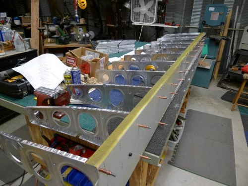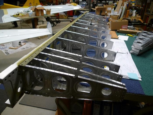Deburring flange and lightening cutouts, flange 90 degree bend, drilling, fluting, scuffing; all main wing ribs. (8/29 to 9/18/2015)