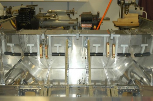 Temporarily installed rudder pedal assembly to firewall shelf as per Steps 8 and 9, page 27-03. Bolts loosely tightened, as the assembly will be removed for interior painting.