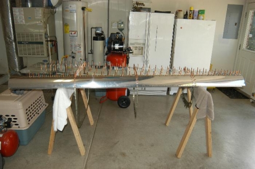 Assembled bottom skins as per Steps 1-6, page 10-06. Attached F-1208, 1209, and 1210 frames to bottom skins as per Steps 7-9, page 10-06. Clecoed F-1281-L&R skins to frames as per Step 1, page 10-07.