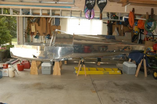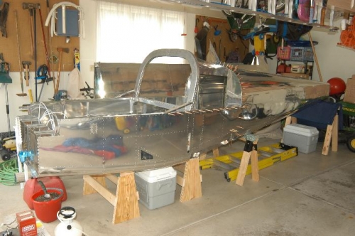 Today was the big day. Susan, Anna, and Claire helped me move the forward fuselage from the workshop to the garage. After carefully positioning it on the stands built several weeks ago and positioning the tailcone, Susan helped me align skin overlaps while the forward fuselage and tailcone assemblies were brought together and clecoed as per Step 1 and Figures 1 and 2, page 25-03. Also clecoed shoulder strap lugs in place.
