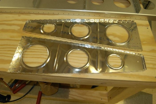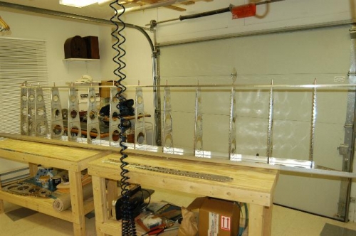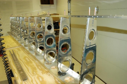 Finished straightening and fluting main ribs. Trimmed forward flanges as called out in Steps 2 and 3. Deburred edges and holes of all main ribs. Match drilled, deburred and attached W-1210B-L&R doublers to main ribs as per Steps 4, 5, 8, and 9. Match drilled, deburred W-1216 hinge bracket assemblies and W-1216B hinge ribs to 4 main ribs as per Steps 6 and 7. Attached all main ribs to W-1206-L spar assembly as per Steps 1-6, Section 15-04.