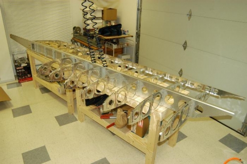 Riveted left rear spar assembly to the aft flanges of W-120 main ribs as per Step 9. Began to attach nose ribs to left wing assembly as per Steps 1-5, page 15-05.