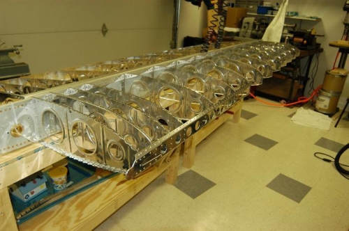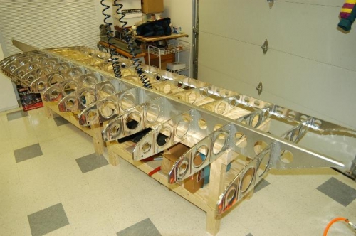 Completed attachment of nose ribs to left wing assembly. Attached left stub spar assembly to forward flanges of appropriate nose ribs as per Step 6, page 15-05. Inserted snap bushings in all nose ribs on left wing assembly. Section 15 work on left wing assembly completed.