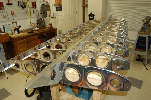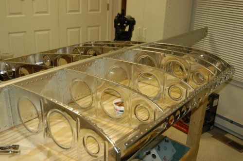 Attached all nose ribs to right wing spar assembly. Attached right stub spar assembly. Inserted snap bushings in all nose ribs. Completed Section 15- both wing skeletons now ready to skin.