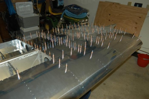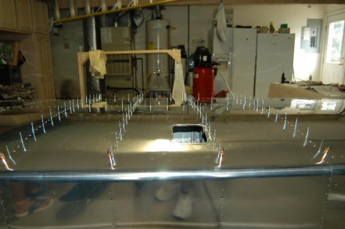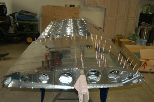 Deburred edges and holes of W-1203B-L outboard upper wing skin. Clecoed and riveted skin as per Figure 3, page 17-03.