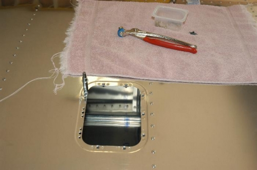 Flipped wing upside down and installed stall warning access hatch, VA-195H as per Figure 4, page 17-04. Left wing done with exception of wing tip which will be installed after right wing has been skinned.