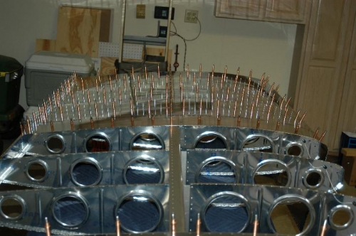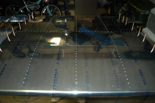 Clecoed and riveted right outboard wing skin, W-1203-R, as per Figure 2, page 17-02. Deburred and clecoed right mid wing skin, W-1202-R.