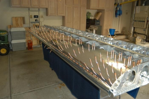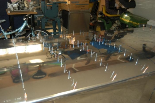 Riveted right mid wing skin, W-1202-R as per Figure 3, page 17-02. Flipped wing over and clecoed and riveted W-1201-R, W-1202-R, and W-1203-R to top of wing skeleton as per Figure 1, page 17-03.