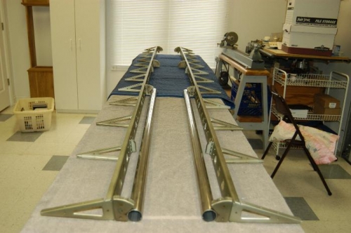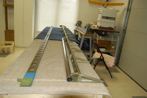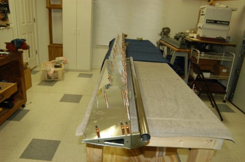Riveted A-1206 pivot brackets to right flaperon spar. Riveted A-1207-L and -R actuation brackets to left and right flaperon spars. Clecoed main ribs to right flaperon spar. Riveted all A-1205 main ribs, A-1210 nose ribs, and counterbalance assemblies to both left and right flaperon spars, thereby completing both internal structures.