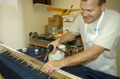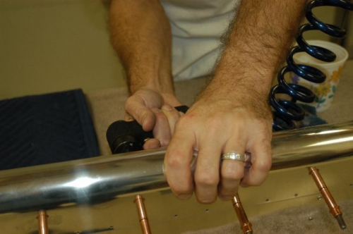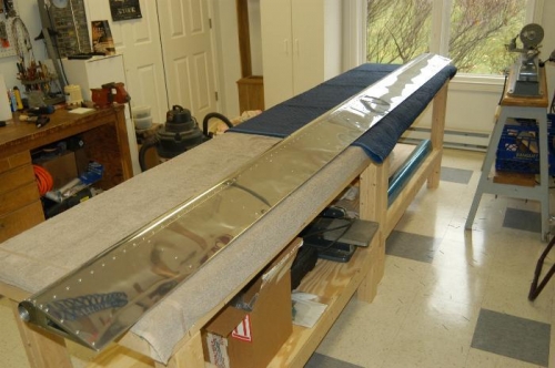 Deburred edges and holes of A-1201C-L and A-1201B-L nose skins and riveted to left flaperon understructure as per Steps 4 and 5, page 18-06. Inserted rod end bearings into left flaperon pivot brackets. Left flaperon completed.