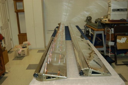 Shaped A-1202A-R and A-1202B skins to match main ribs. Edges and holes of skins deburred. Skins riveted to ribs as per Step 2, page 18-06.