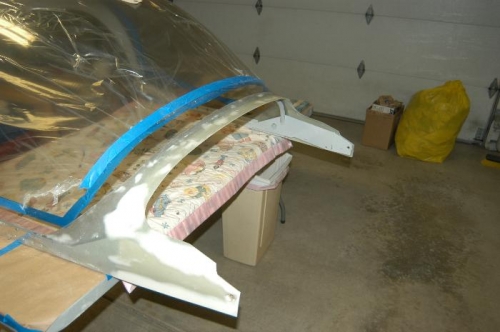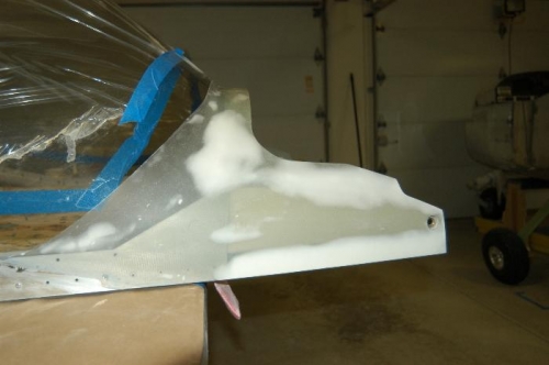 Started trimming and sanding of canopy fiberglass edges. Enlarged pivot bolt holes and applied epoxy/flox coat to exposed foam areas.
