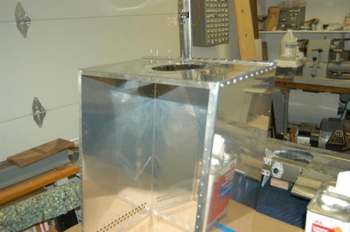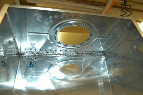 Began assembly of fuel tank by attaching fuel flange and main tank skin to the fwd bulkhead assembly, installing the bulkhead fitting, and attaching the fwd tank bracket as per Steps 9-11, page 37-02. All steps completed only after mating surfaces were scuffed, cleaned with lacquer thinner and coated with Fuelmaster fuel tank sealant.