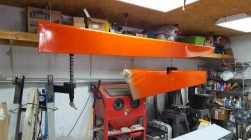 Brought the rudder to the airport and hung it on the plane. Masked the stripes to match the verticle stabilizer.. Brought the rudder back to the shop, finished masking and painted the orange. Painted on r of the ailerons orange but couldn't do the other or the flaps due to the lovebugs swarming.