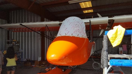 Routed and anchored the trim wire op the trailing edge of the vert. staboilizer. Installed the horizontal stab tips. Initial installation of the nose bowl and windshield. installed the elevators and rudder.
