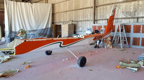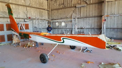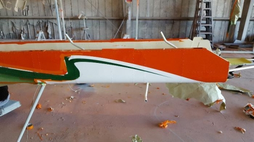 The shop applied the green stripe and "N" numbers. Later in the day we finished un-masking the airplane.