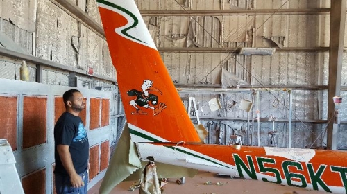 Applied the Miami Hurricane logo to the verticle stabilizer. Moved the airplane back to the hanger.