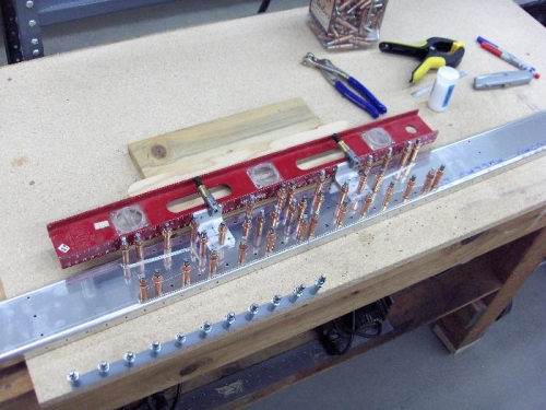 Removed plastic from HS front spar doubler and front spars. Match drilled doubler to spars. Clecoed attach angles to front spars and clamped bottoms of angles to a level for a straight edge. Waiting for a new drill bit to drill remaining holes for attach angles in the spars. The holes in the attach angles were initially drilled to 1/8. Will drill holes in spar using the angles holes as guides, to 1/8, and then ream assembly to #30.