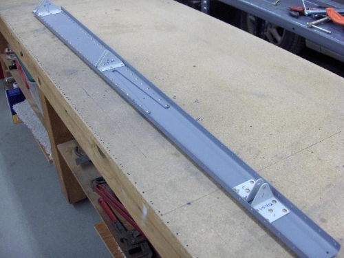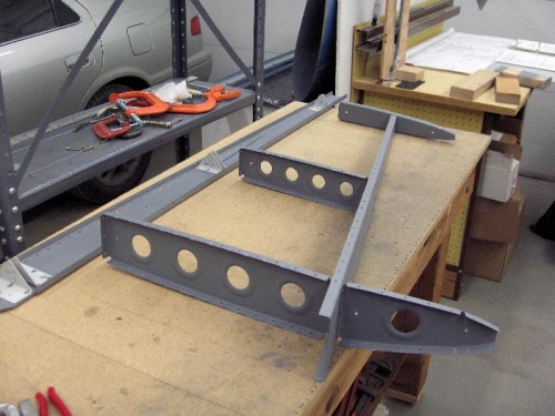 Finished riveting the rear spar components together. See image 1, backside, and image 2, frontside, of rear spar. I drilled out one rivet because it clinched, and another one that I mistakenly put in a rib hole, but other than that things went well. I used the pneumatic squeezer for this. Then I started riveting the VS skeleton together. Orndorff says to leave the bottom rib sections until later so that the middle rib can be riveted to the rear spar with plain 470 rivets instead of the pop rivets called for in the plans. But the angle of the bottom ribs to the front spar makes setting those rivets a real chore, so I went ahead and set those them now. As it was I had to do one of them over because it clinched. If I was better with the rivet gun and the squeezer (had more experience) it might have been worth trying. I am also not happy with the 2 rivets that hold the top rib to the spar. I'm thinking about drilling those out also. See image 3 for how things looked at the end of this session.