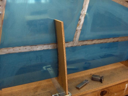 I finished riveting the skin to the front VS spar and the middle rib. I need to have an inspection done on the work so I can cleco the rear spar to the VS and close out the VS. I think I'm starting to get a feel for what a properly set rivet looks like without having to use the guage. I'm also getting a better feel for the rivet gun and bucking bar. Lin helped me with about 15 rivets that were a stretch for me to do by myself because my arms aren't quite long enough. She bucked and we are starting to get faster. Image 1 is a shot of the inside of the VS between the middle rib and the root rib. You can see areas where I let the bucking bar (covered with tape) rest on the spar while shooting rivets. It scuffed the primer a bit, but made bucking by myself much easier, since I only had to control the bar in 2 dimensions instead of 3. Image 2 is a shot of the top VS bay between the middle rib and the top rib. Same scuffing as on the bottom, but there are a couple places where I scratched the metal on the spar. That was for the first 2 or 3 rivets I shot, and hadn't figured out that I needed some padding on the bucking bar. Image 3 is an overall shot of the right side of the VS in its current state.