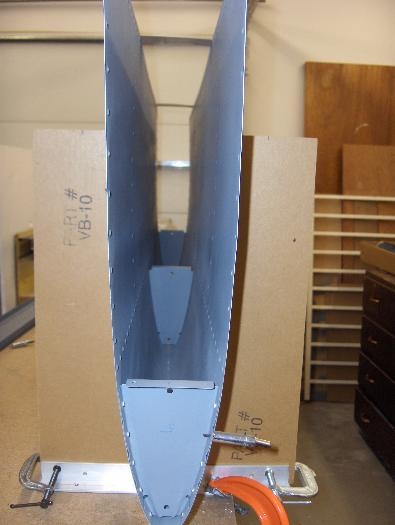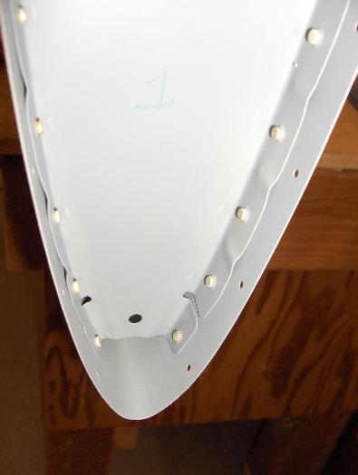 Lin and I did the first riveting on the HS. We started with the left side middle nose rib. Lin bucked and I ran the gun. She did a good job. The first rivet is the forward most rivet and the most difficult to get at for the bucker. I'm not sure how anyone ever set these before the advent of the small tungsten bucking bars. I highly recommend this tool. It is well worth the $$. After setting the middle nose rib, I riveted the end nose ribs with the squeezer. Pretty straight forward, except for one forward most rivet that was difficult to get the squeezer on because of the flutes in the nose of the rib. The squeezer slipped and put a little notch on one side of the shop head. I'll ask Joe if I need to redo it. The rivet is the lowest one on the right side of the nose in image 2. It doesn't show the imperfection very well in the photo, but it is there.