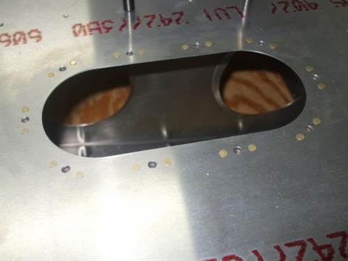 Scuffed, cleaned, and cortec skin edges where they overlap. Reinstalled all skins except of O/B nose. Riveted on 5 of 6 stiffners, ran out of rivets.Insterted rivets in every other hole in preperation for riveting.Riveted in platenuts for fuel sender access cover.